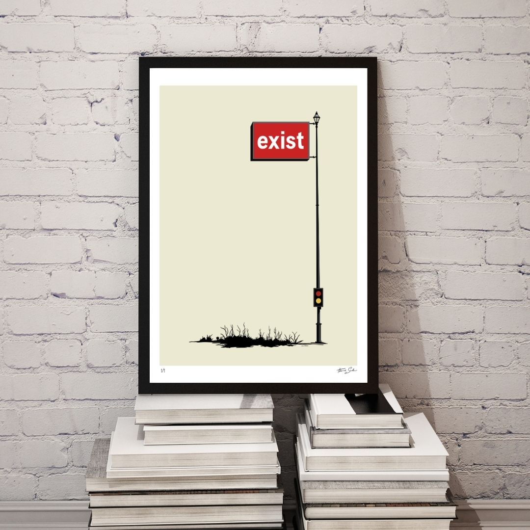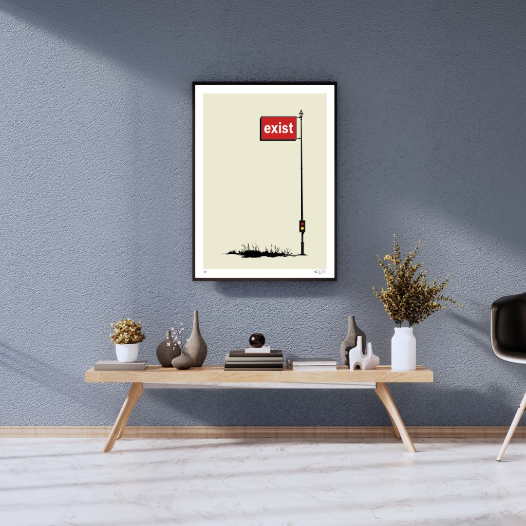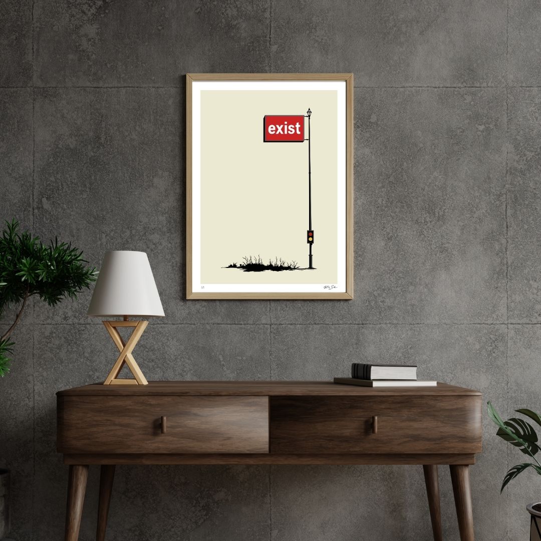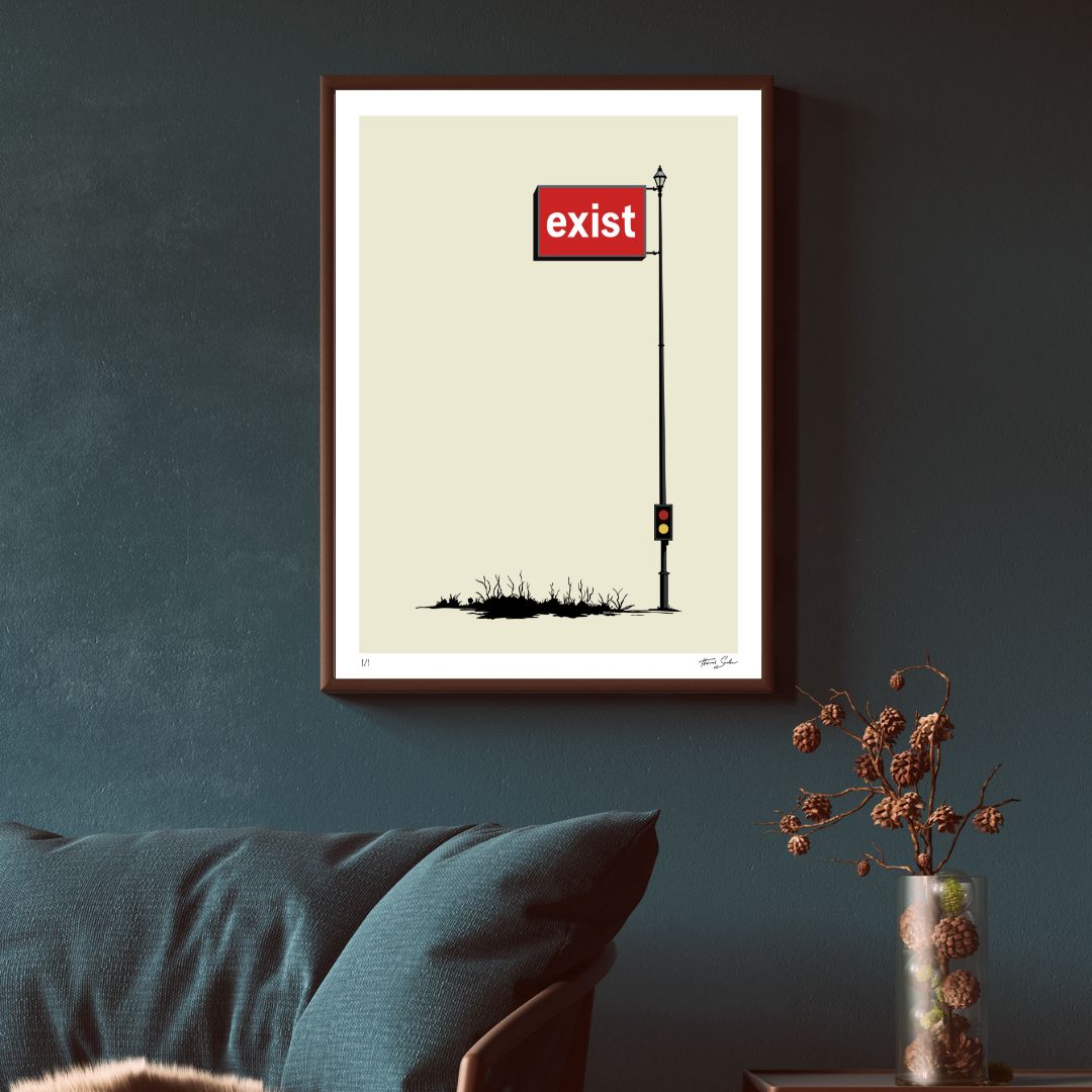 A lone streetlight holds a red sign that simply reads exist — both command and confession. Below, weeds break through the pavement, quietly affirming the message. The piece confronts the viewer with the raw simplicity of being: no embellishment, no distraction — just the insistence that presence itself is enough.