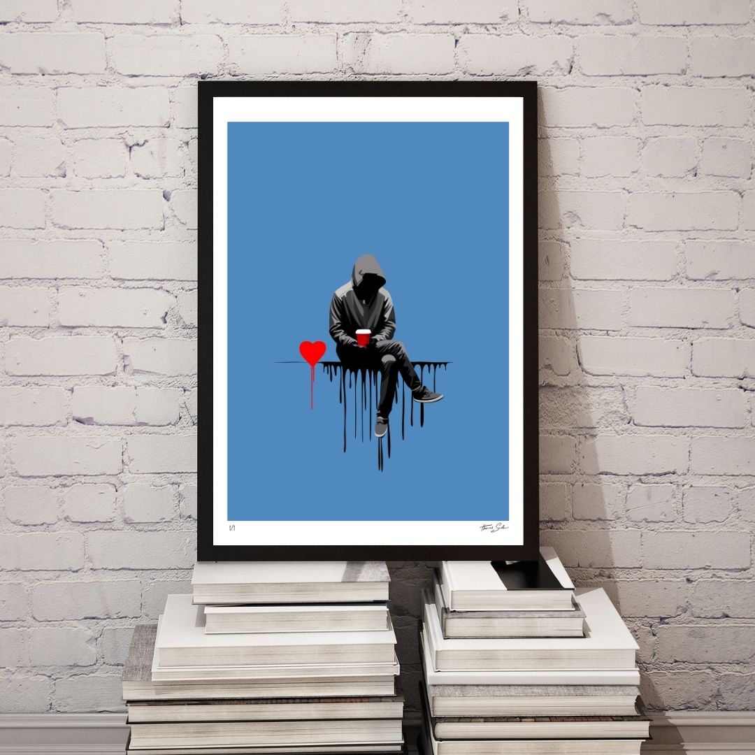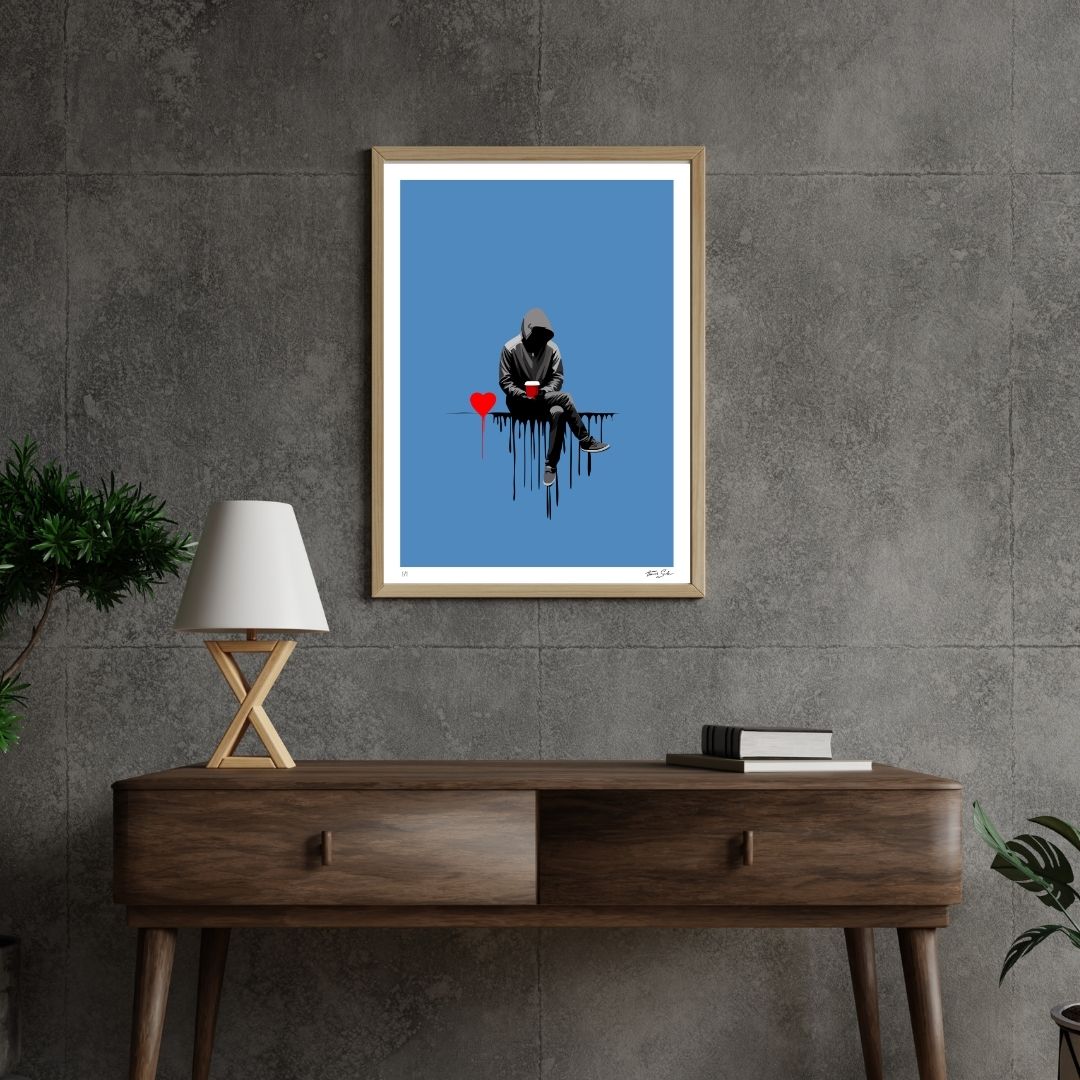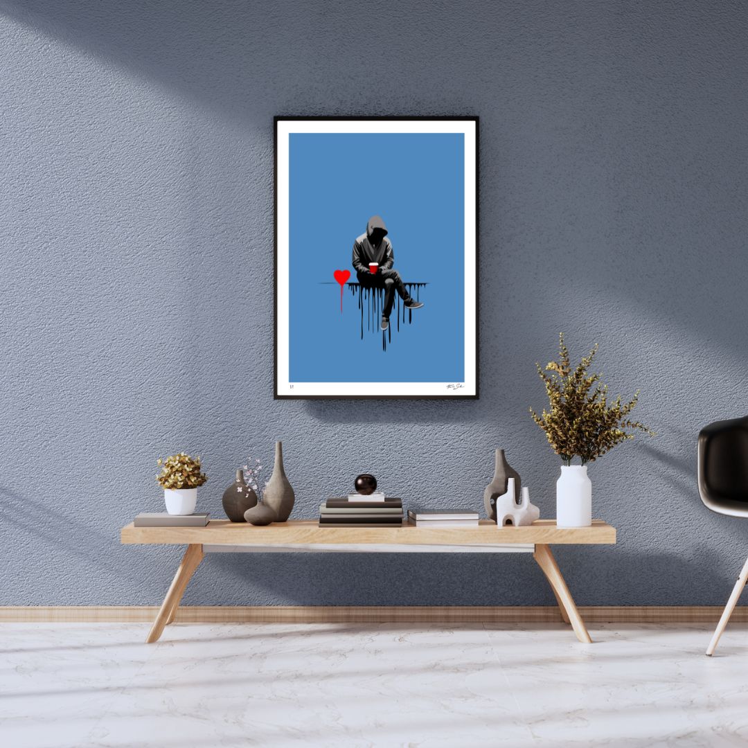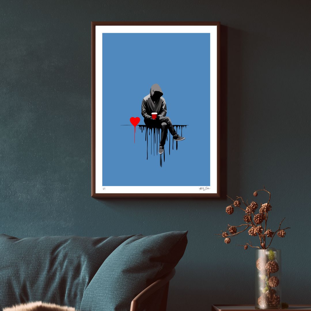 A faceless figure sits in quiet contemplation, holding a red cup beside a bleeding heart painted into the void. The blue emptiness behind him hums with the ache of distance — the pause after love spills out and the silence that follows. Between the drips of paint and the shape of the heart, the artwork captures the fragile beauty of feeling too much in a world that feels too little.