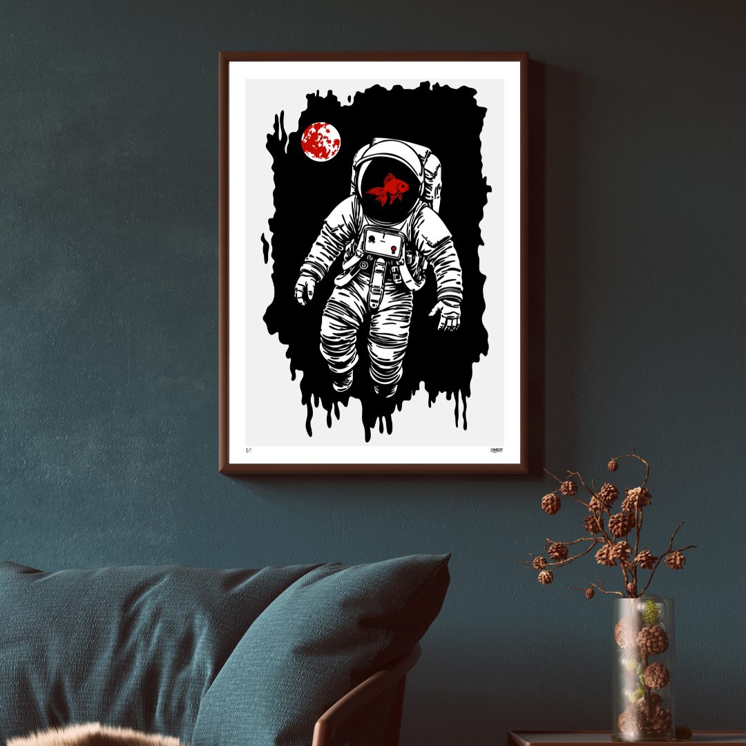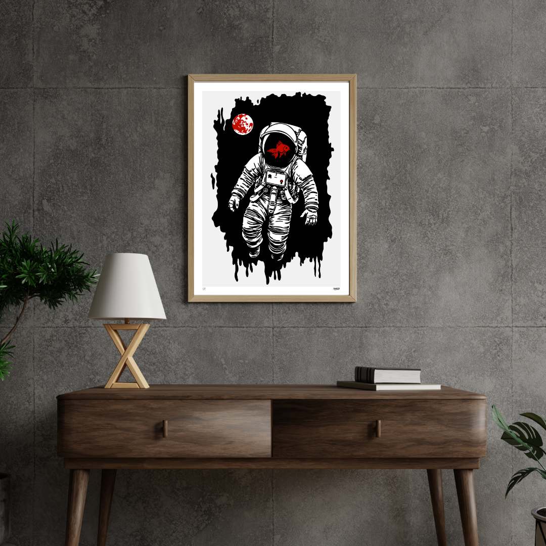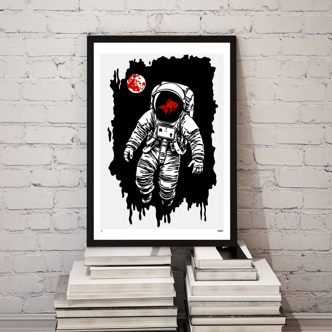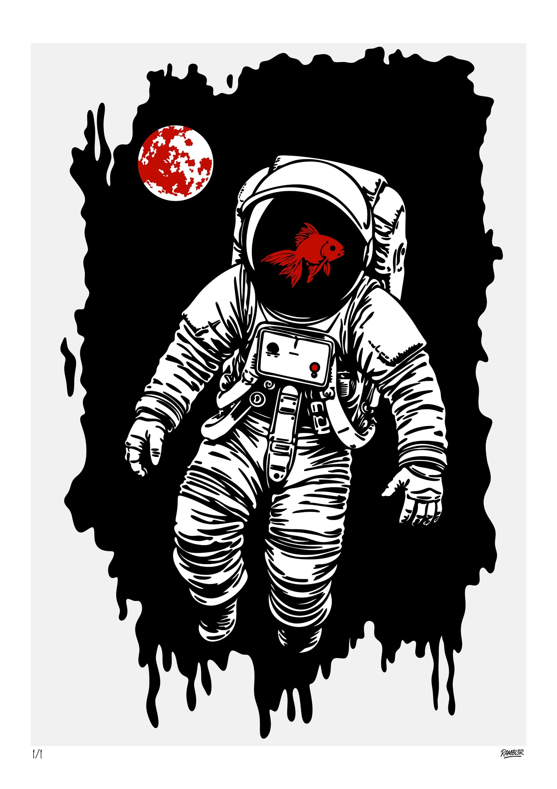 A lone astronaut drifts through silent space, a crimson goldfish swimming inside his helmet — fragile life contained within infinite void. The Drift reflects the paradox of existence: isolation wrapped in wonder, absurdity disguised as calm. The black expanse melts like ink, while the red fish pulses as a heartbeat against the emptiness. In true Rambl3r fashion, the piece turns contradiction into poetry — a meditation on survival, solitude, and the beauty of losing direction.
