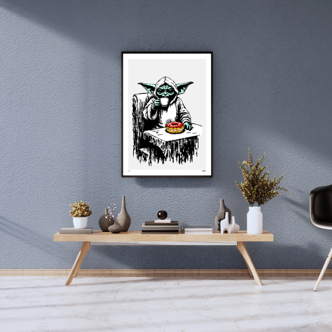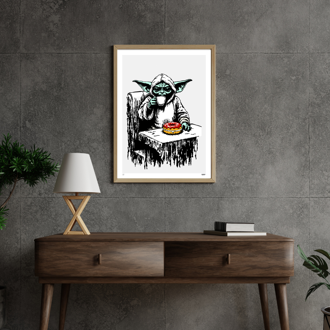 Serenity meets sugar in The Force of Habit, where a calm green figure sits quietly with a coffee and a single glazed donut. Cloaked in wisdom yet drawn to earthly pleasures, he embodies the balance between enlightenment and indulgence. The Rambl3r stencil style turns a pop culture icon into a symbol of modern ritual — mindfulness in the mundane, irony in the ordinary. A quiet rebellion brewed in caffeine and comfort.